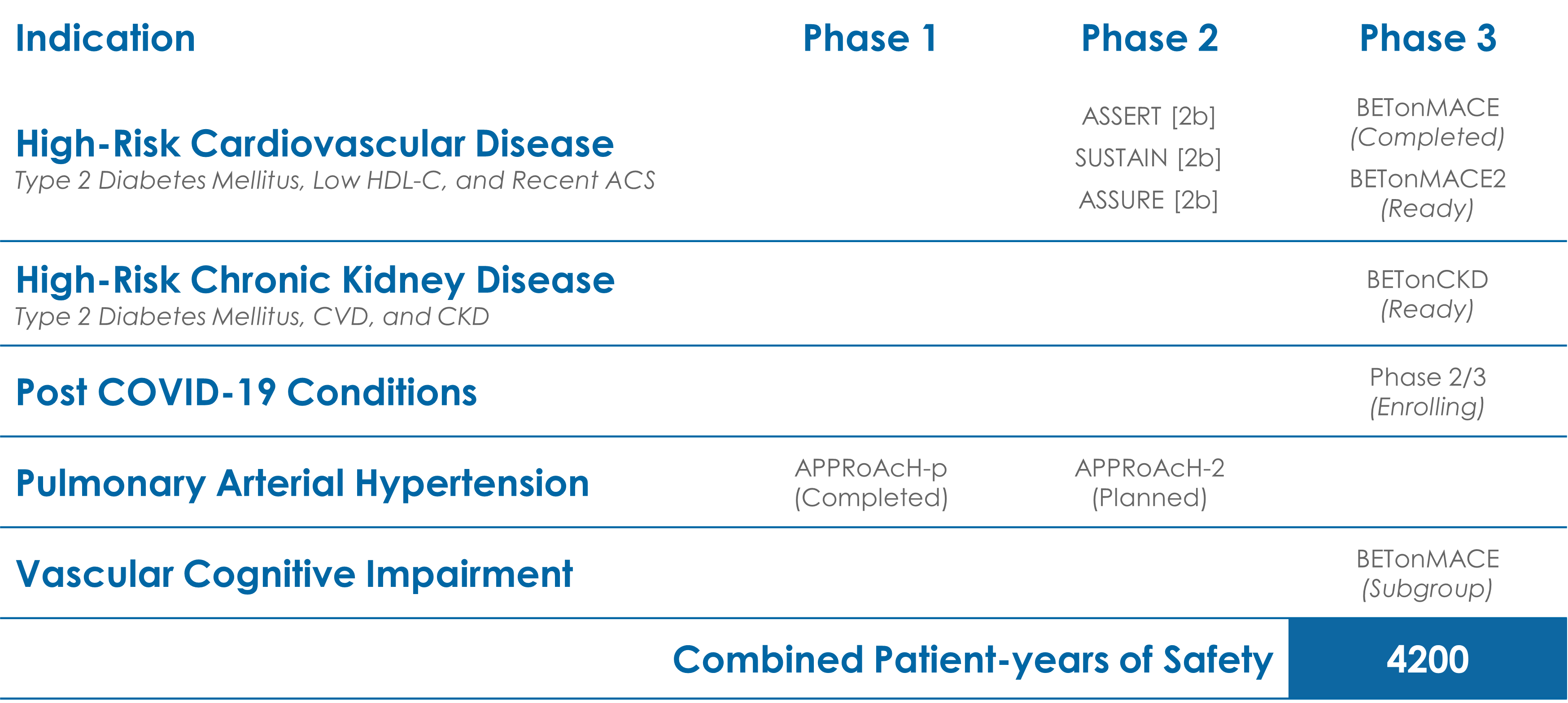 Apabetalone continues to be evaluated for the treatment of patients with chronic kidney disease. A Phase 2A program is also planned for CKD patients on dialysis, which will examine apabetalone’s safety in this population and as well as its ability to improve key biomarkers.
